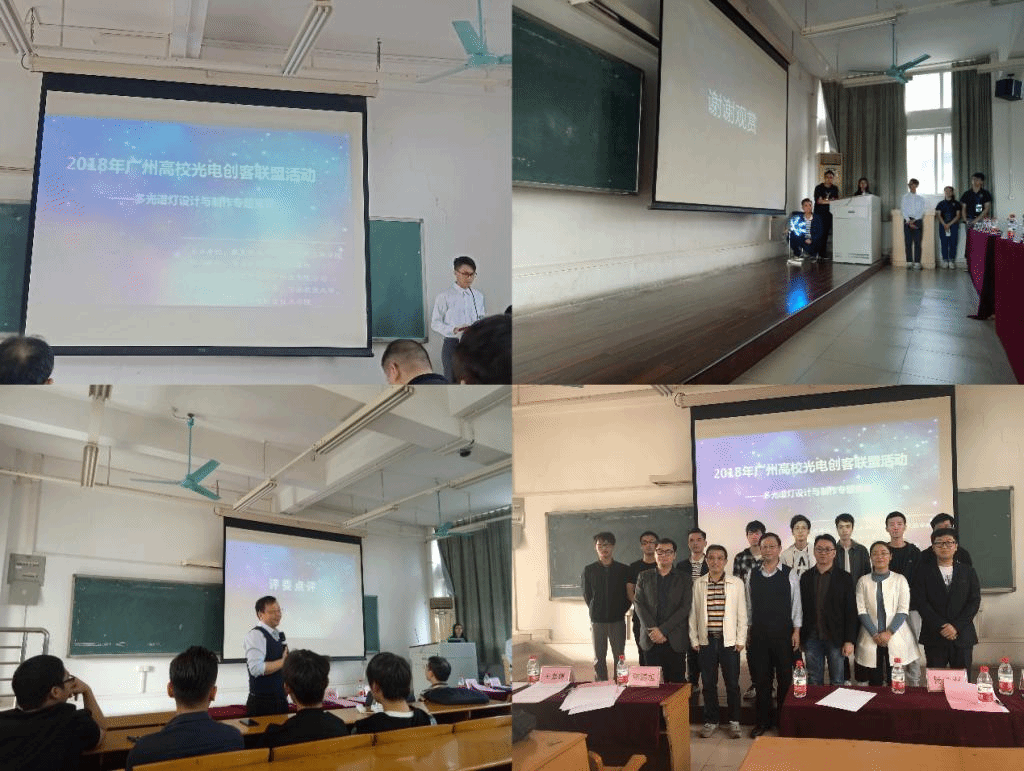 2018年11月30日,由taptap点点官方网站主办的“2018广州高校光电创客联盟活动——多光谱灯设计与制作专题竞赛”在taptap点点官方网站二教304举行。taptap点点官方网站副院长冯明库教授、广州高校光电创客联盟成员华南农业大学麦志杰博士和广东工程职业技术学院吴小玲老师、北京杏林睿光科技有限公司工程师王志强以及学生代表200多人出席本次竞赛。本次竞赛邀请到了中山大学物理实验教学国家级示范中心主任蔡志岗教授、中山大学王嘉辉博士和taptap点点官方网站陈湛旭副教授担任竞赛评委。