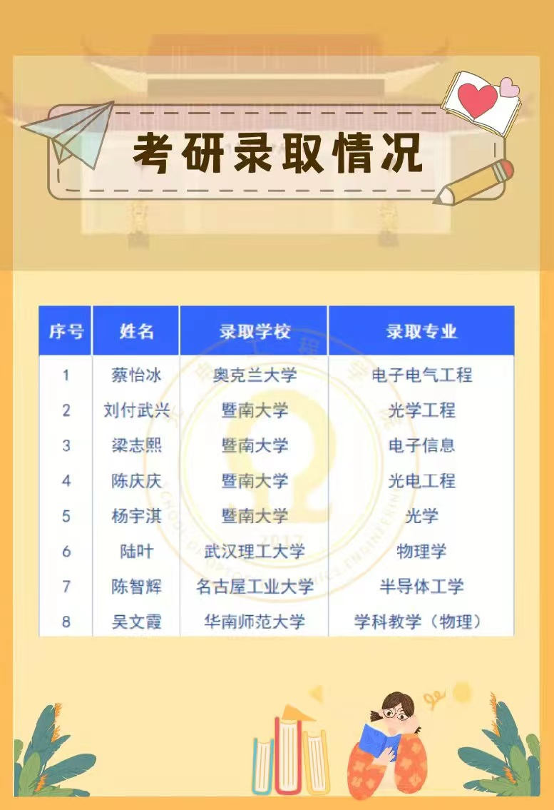 辛勤耕耘有矢志,硕果飘香再一年。随着2022年全国硕士研究生招生录取工作接近尾声,taptap点点官方网站考研学子喜讯频传,目前已有30名学生被暨南大学、武汉理工大学、华南师范大学、江南大学、河北大学、深圳大学、名古屋工业大学、奥克兰大学等国内外高校录取,其中2018级有25人,在应届生中占比11.7%。(名单如下,排名不分先后)