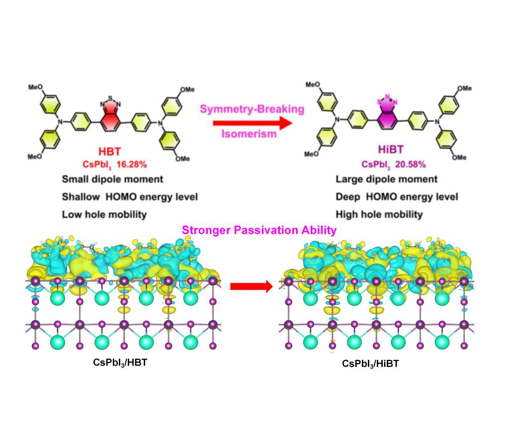 该研究围绕新型非掺杂小分子空穴传输层材料的分子设计及其在钙钛矿太阳能电池的应用展开。研究团队提出了一种对称性破缺策略,构筑了一类D-A-D型异构化小分子,并将其作为非掺杂空穴传输层(HTL)应用于全无机钙钛矿太阳能电池。研究表明,通过打破分子对称性,可有效调控分子的偶极矩、能级排布以及对钙钛矿缺陷的钝化能力,从而显著提升光伏器件的关键参数和长期稳定性。研究团队成功研制出光电转换效率高达20.58%的高稳定性器件,该效率水平位居当前文献报道的非掺杂空穴传输层无机钙钛矿太阳能电池的前列,进一步推动了高效、高稳定无机钙钛矿光伏技术的发展。该研究成果以题目《Symmetry-Breaking Strategy Yields Dopant-Free Small Molecule Hole Transport Materials for Inorganic Perovskite Solar Cells with 20.58% Efficiency and Outstanding Stability》在《Angewandte Chemie International Edition》在线发表。taptap点点官方网站本科生蔡汇敏为该论文第一作者,贾涛为通讯作者,我校为第一通讯署名单位。